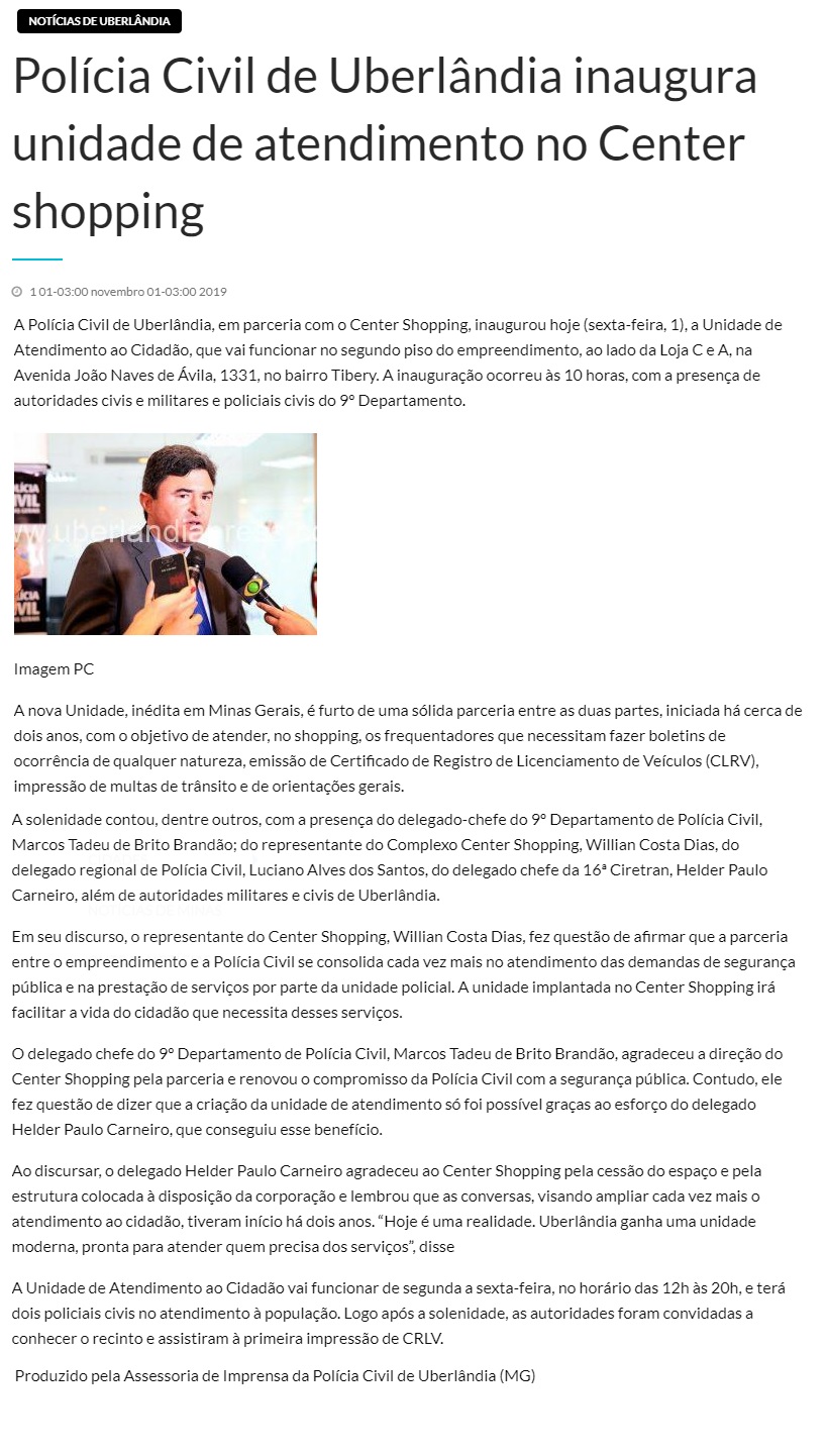 ONLINE - Polícia Civil de Uberlândia inaugura unidade de atendimento no Center Shopping - (01/11)