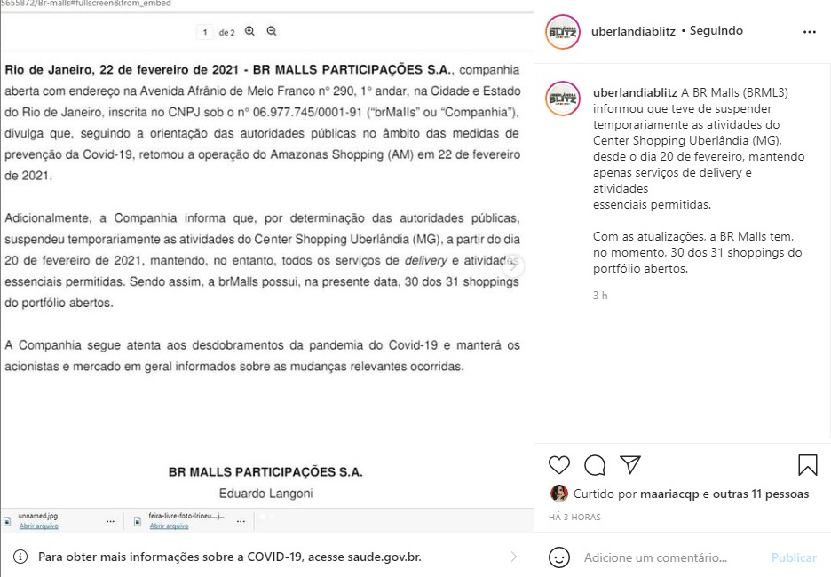 ONLINE - Post falando sobre o fechamento do Center Shopping devido ao novo decreto - 23.02