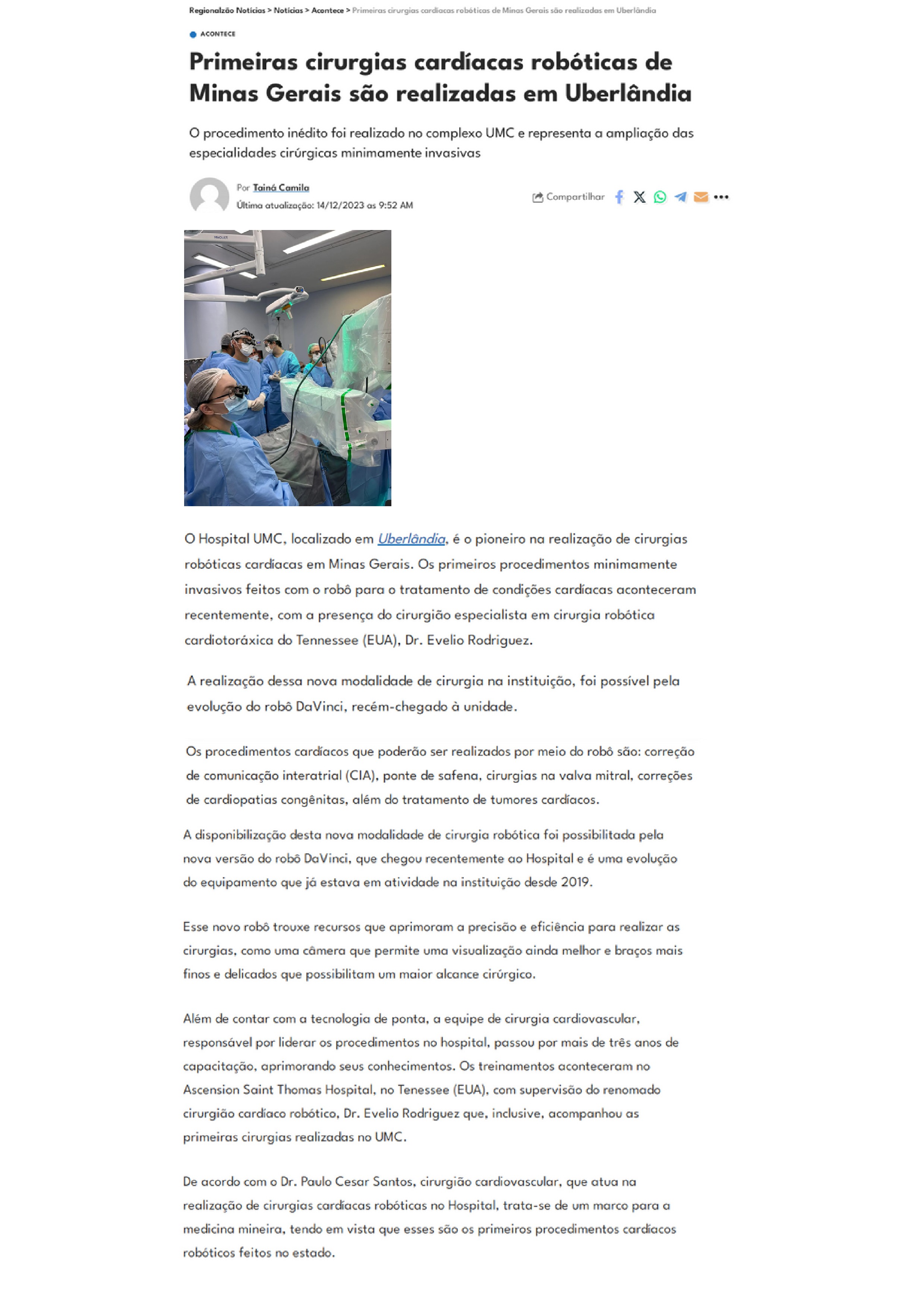 ONLINE - Primeiras cirurgias cardíacas robóticas de Minas Gerais são realizadas em Uberlândia - 14.12