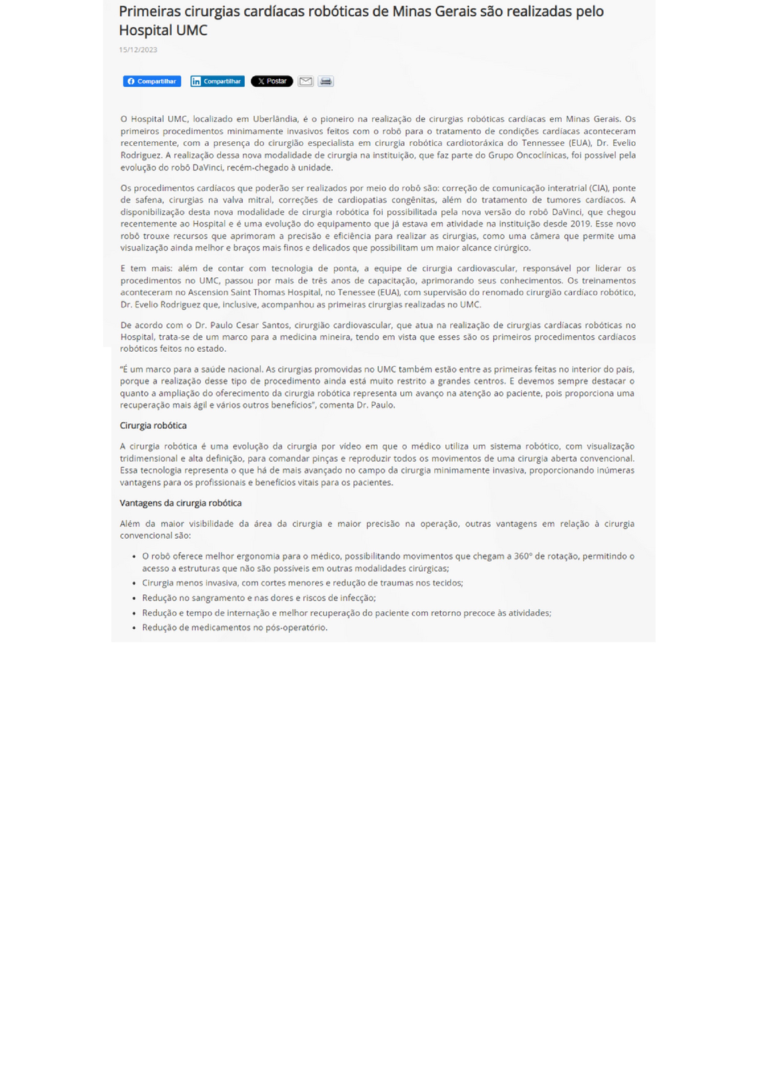 ONLINE-Primeiras cirurgias cardíacas robóticas de Minas Gerais são realizadas pelo Hospital UMC-15.12