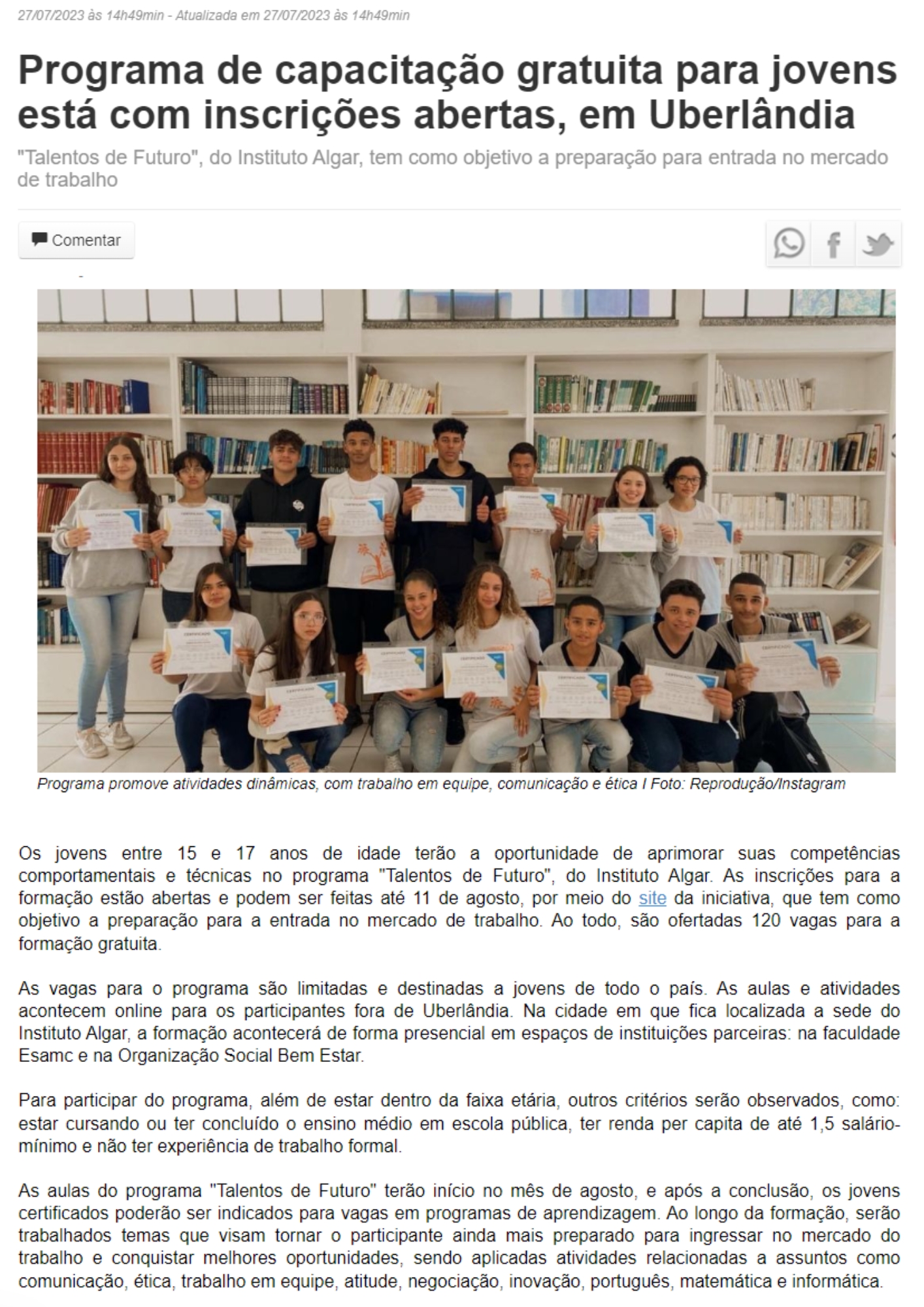 ONLINE - Programa de capacitação gratuita para jovens está com inscrições abertas, em Uberlândia - 28.09