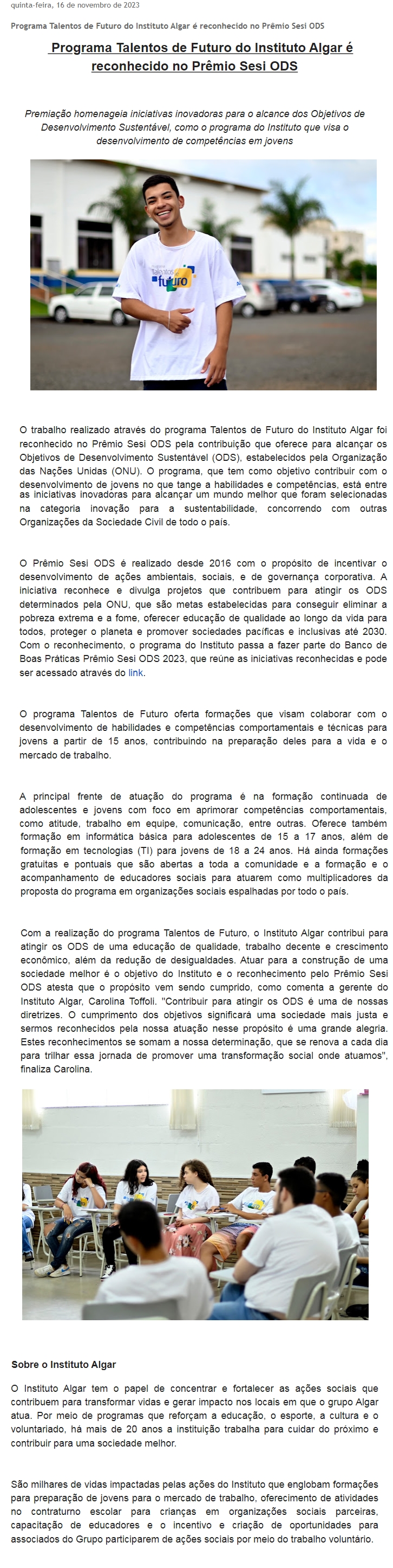 ONLINE - Programa Talentos de Futuro do Instituto Algar é reconhecido no Prêmio Sesi ODS - 16.11