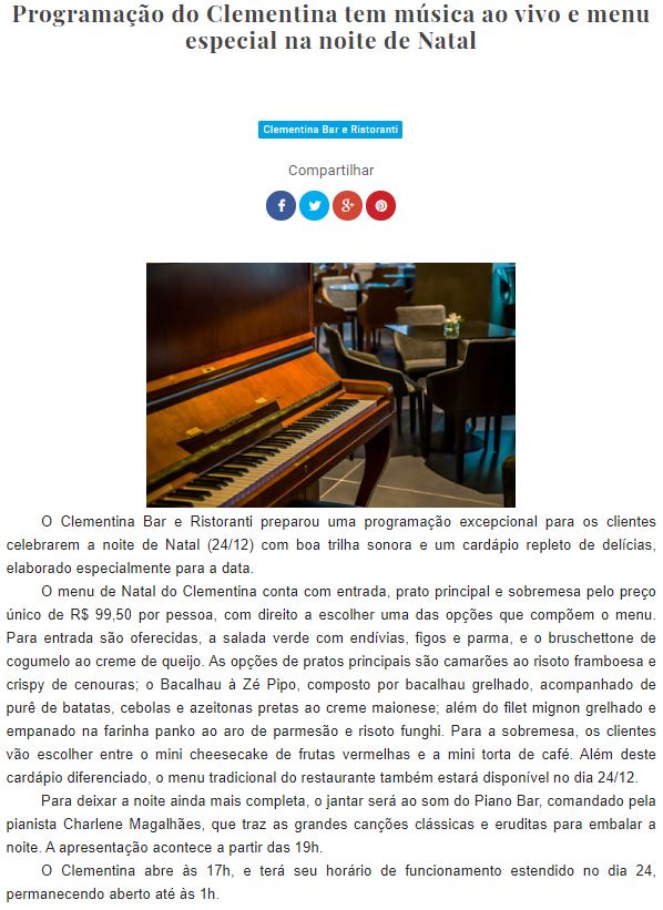 ONLINE - Programação do Clementina tem música ao vivo e menu especial na noite de Natal (23/12)