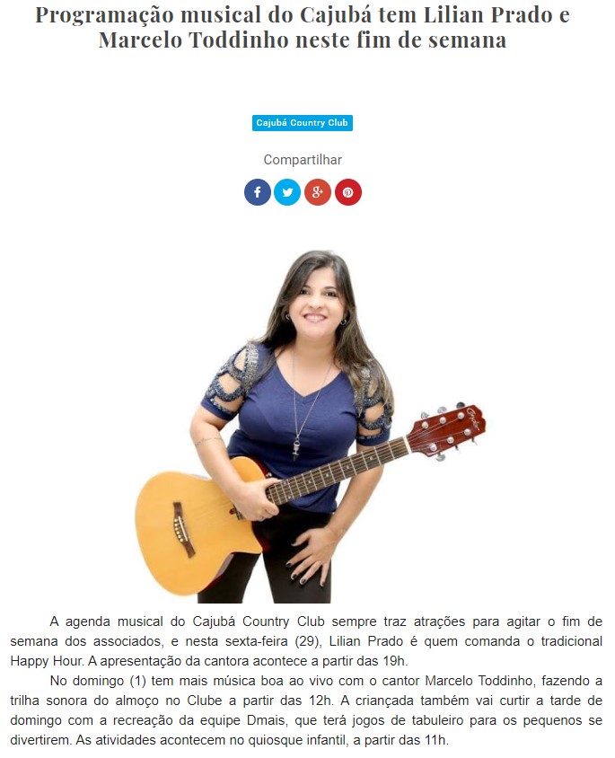 ONLINE - Programação musical do Cajubá tem Lilian Prado e Marcelo Toddinho neste fim de semana (27/11)