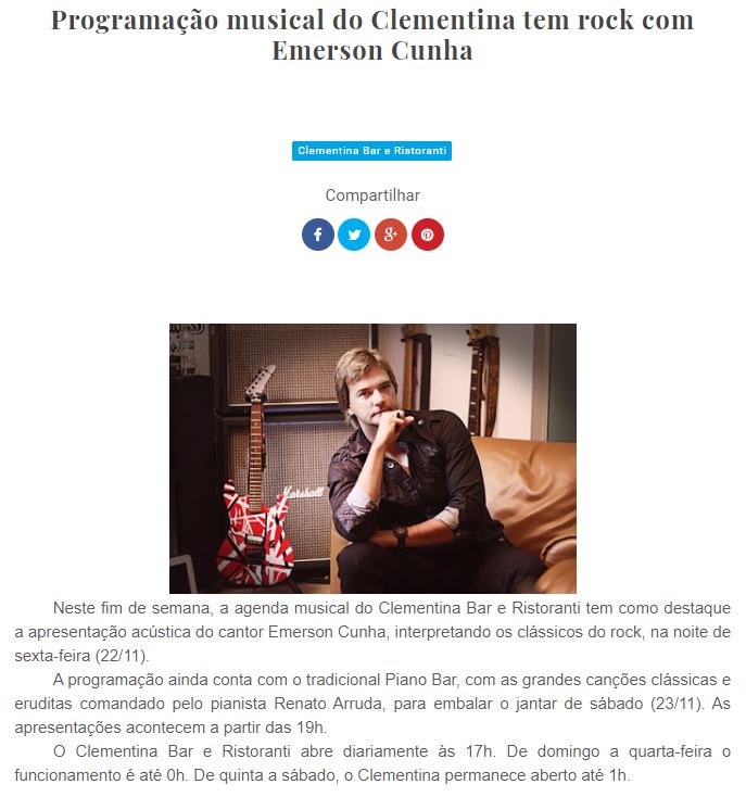 ONLINE - Programação musical do Clementina tem rock com Emerson Cunha (22/11)