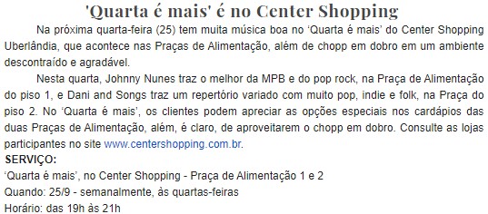 ONLINE - 'Quarta é mais' é no Center Shopping (24/09)