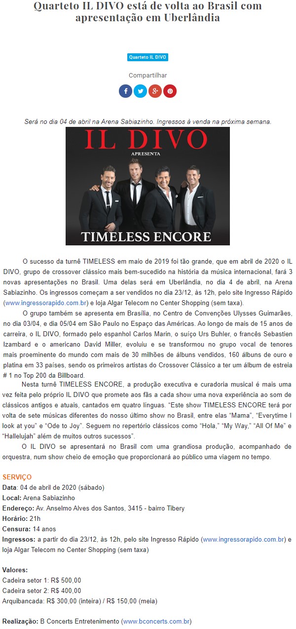 ONLINE - Quarteto IL DIVO está de volta ao Brasil com apresentação em Uberlândia - PONTO DE VENDAS (18/12)