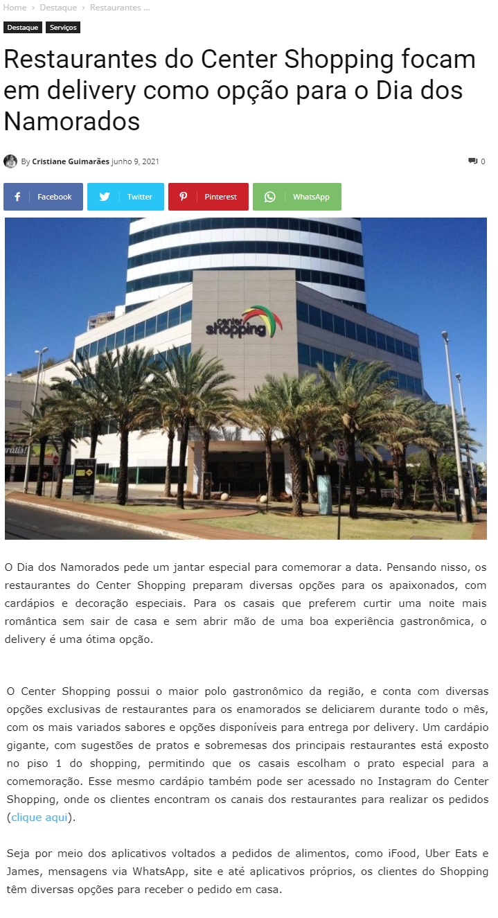 ONLINE - Restaurantes do Center Shopping focam em delivery como opção para o Dia dos Namorados - 09.06