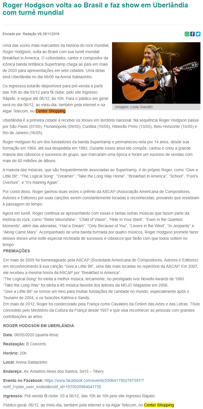ONLINE - Roger Hodgson volta ao Brasil e faz show em Uberlândia com turnê mundial - PONTO DE VENDAS (29/11)