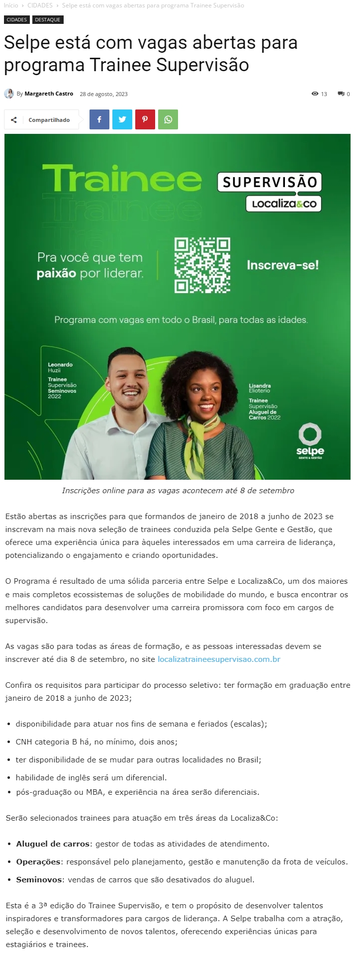 ONLINE-Selpe está com vagas abertas para programa Trainee Supervisão-28.09