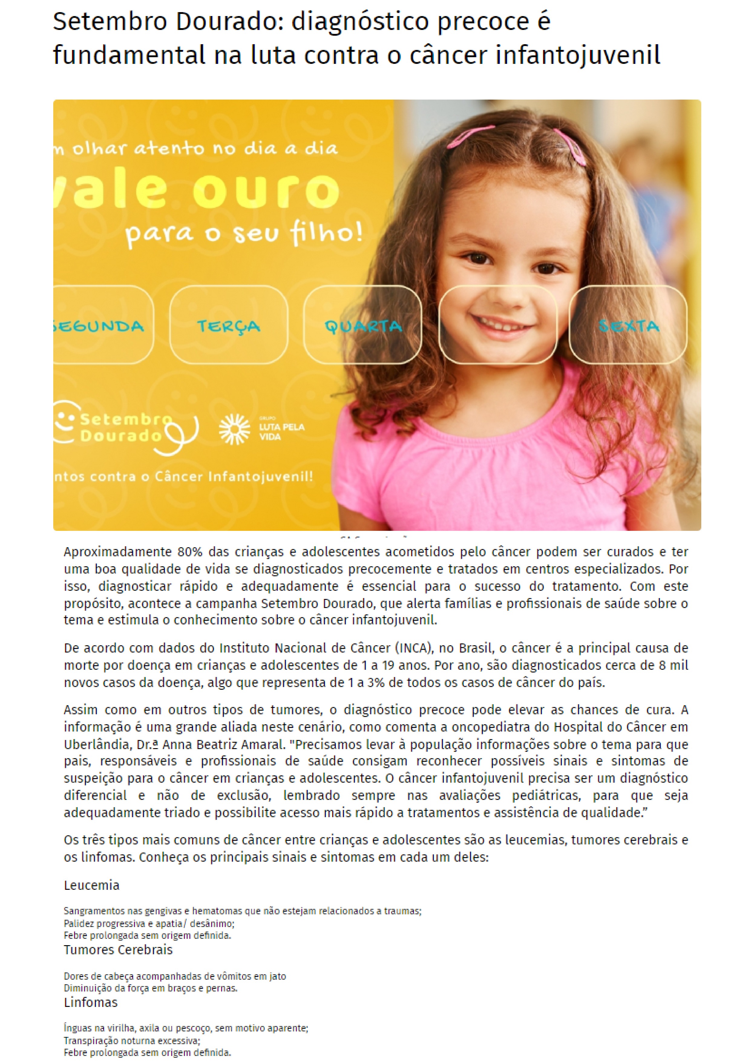 ONLINE - Setembro Dourado: diagnóstico precoce é fundamental na luta contra o câncer infantojuvenil - 19.09