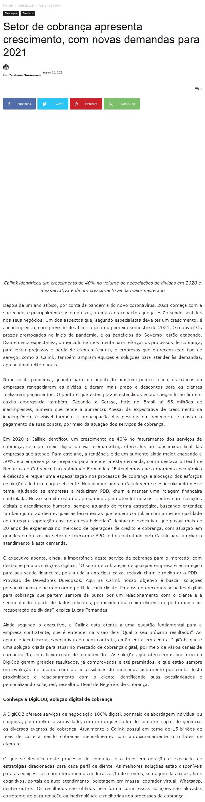 ONLINE - Setor de cobrança apresenta crescimento, com novas demandas para 2021 - 28/01