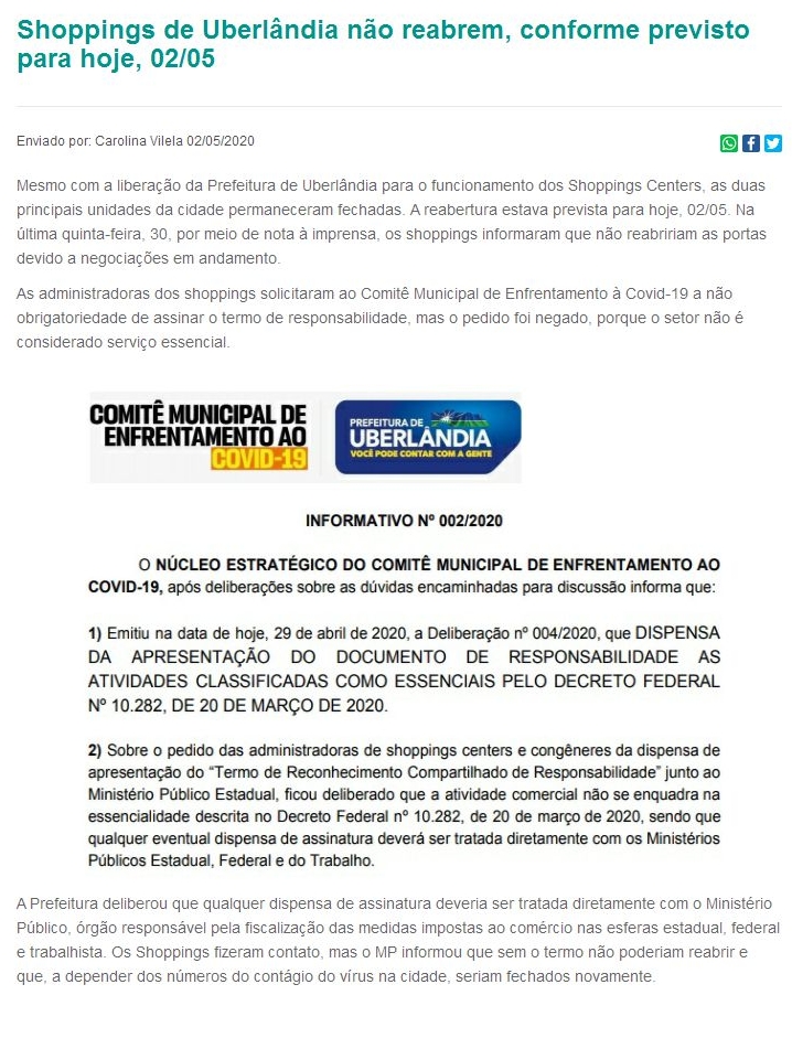 ONLINE - Shoppings de Uberlândia não reabrem, conforme previsto para hoje, 02/05 - 02/05