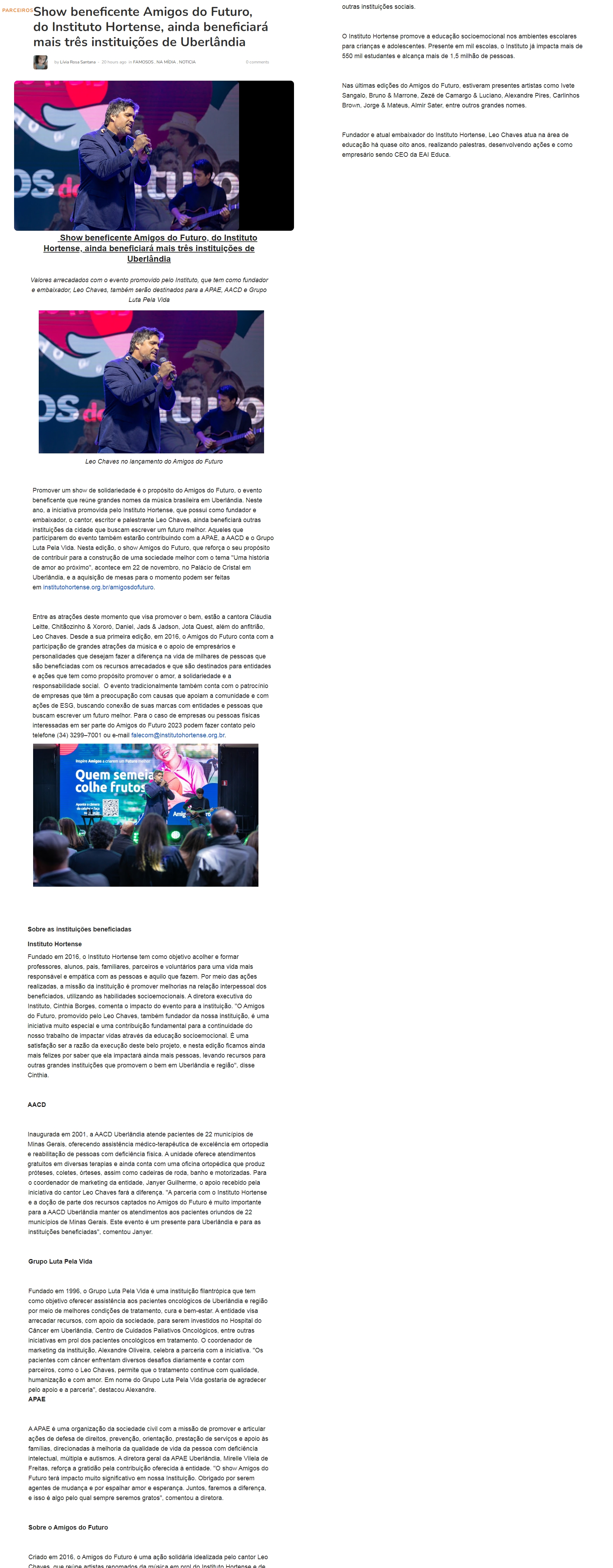 ONLINE-Show beneficente Amigos do Futuro, do Instituto Hortense, ainda beneficiará mais três instituições de Uberlândia-16.11