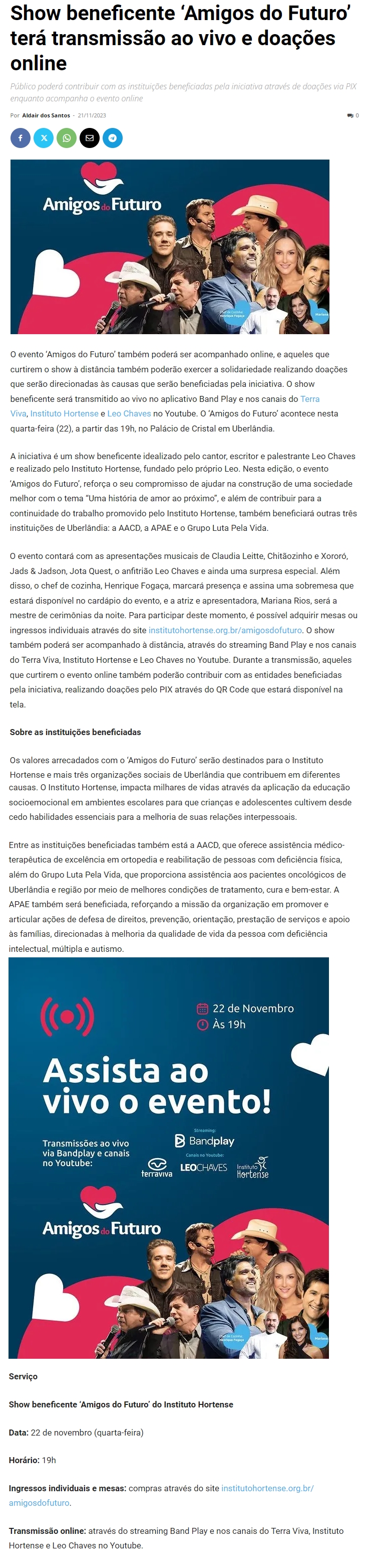 ONLINE - Show beneficente 'Amigos do Futuro' terá transmissão ao vivo e doações online - 21.11