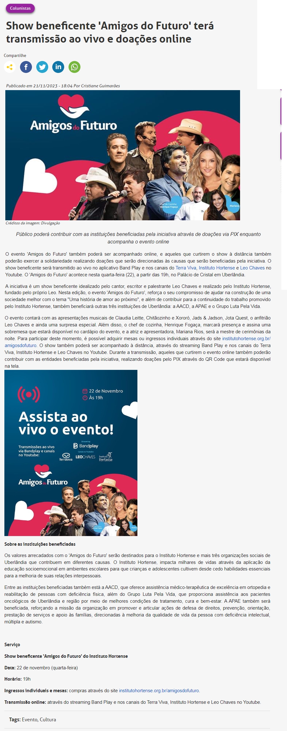 ONLINE - Show beneficente 'Amigos do Futuro' terá transmissão ao vivo e doações online - 21.11