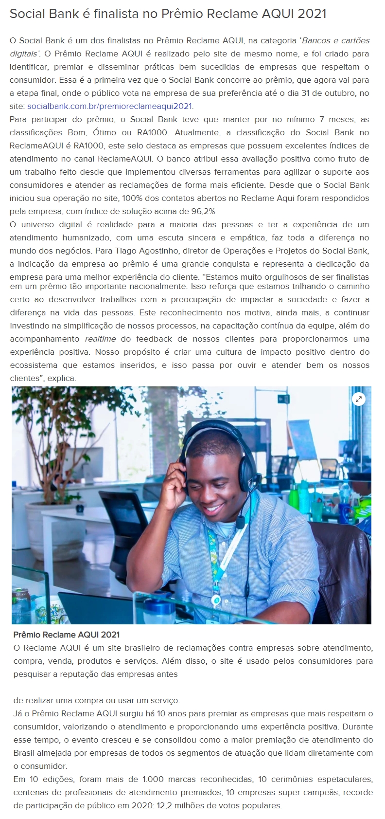 ONLINE-Social Bank é finalista no Prêmio Reclame AQUI 2021-12.09