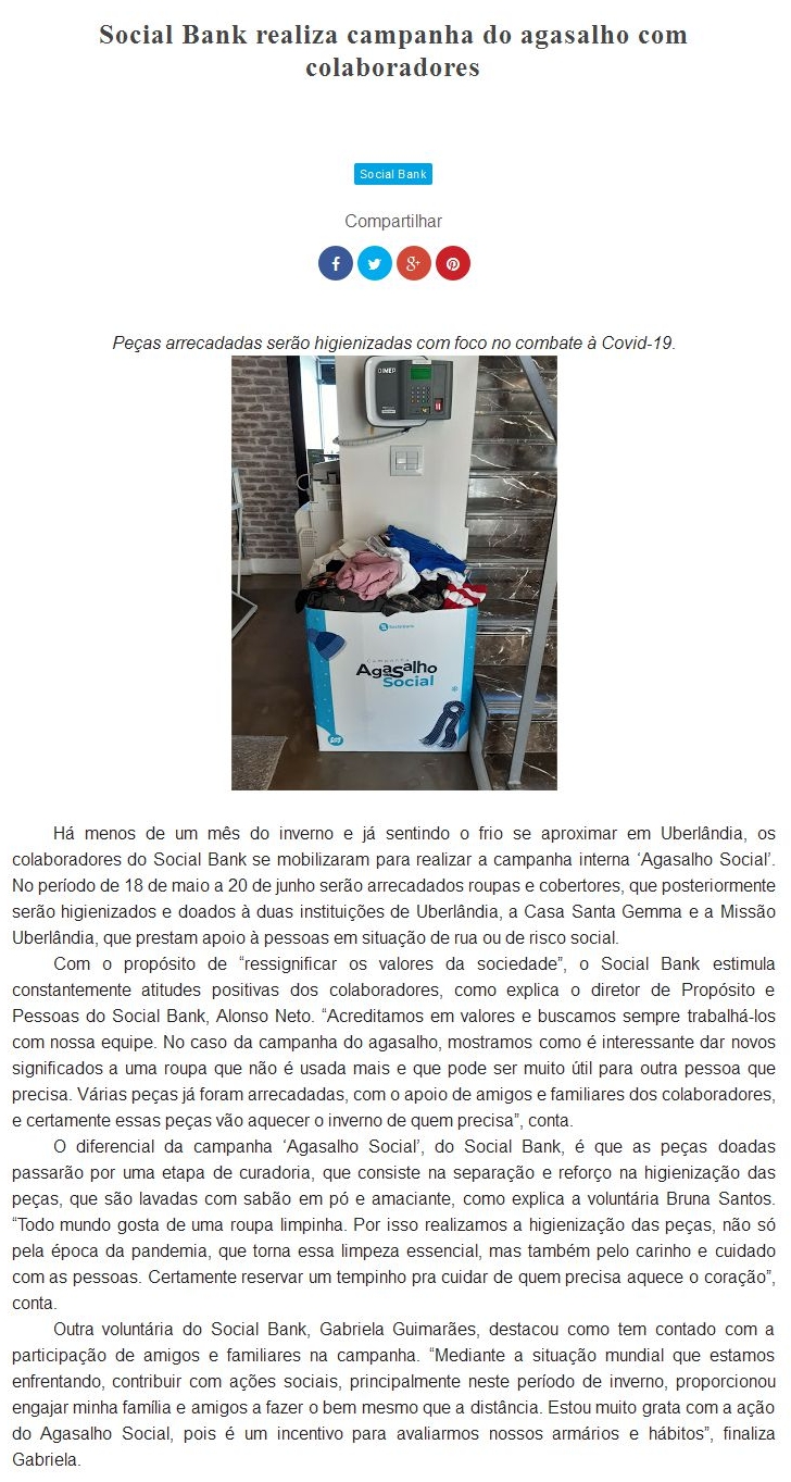 ONLINE - Social Bank realiza campanha do agasalho com colaboradores - 08/06
