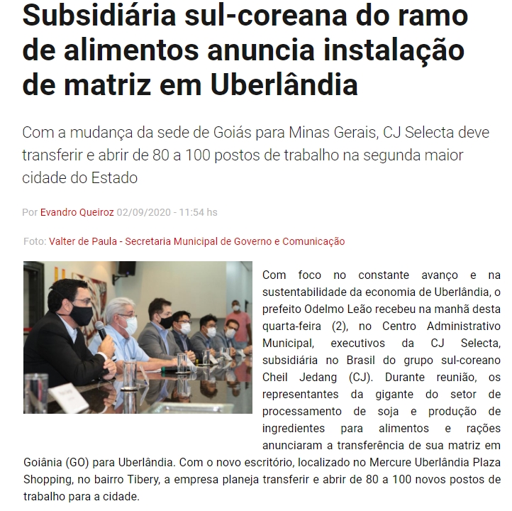 ONLINE - Subsidiária sul-coreana do ramo de alimentos anuncia instalação de matriz em Uberlândia - menção ao Hotel Mercure - (02/09)