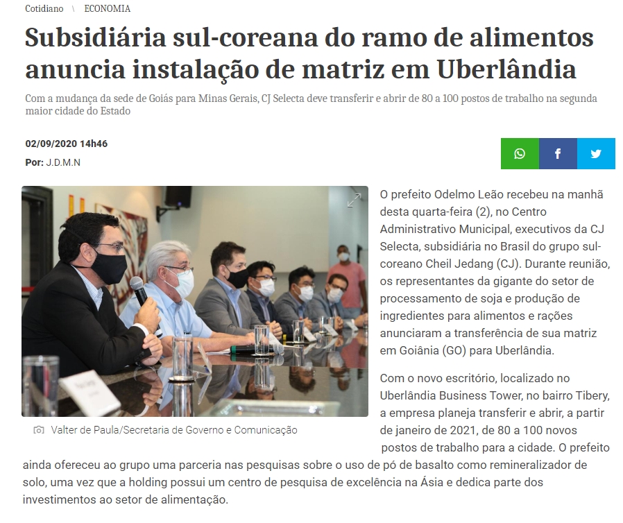 ONLINE - Subsidiária sul-coreana do ramo de alimentos anuncia instalação de matriz em Uberlândia - menção ao UBT - 02/09