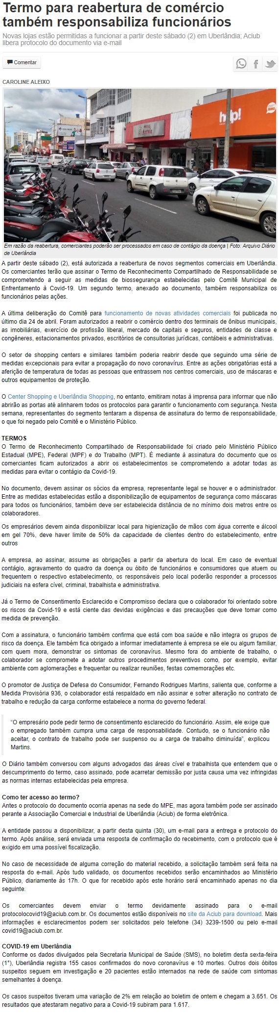 ONLINE - Termo para reabertura de comércio também responsabiliza funcionários - 01/05