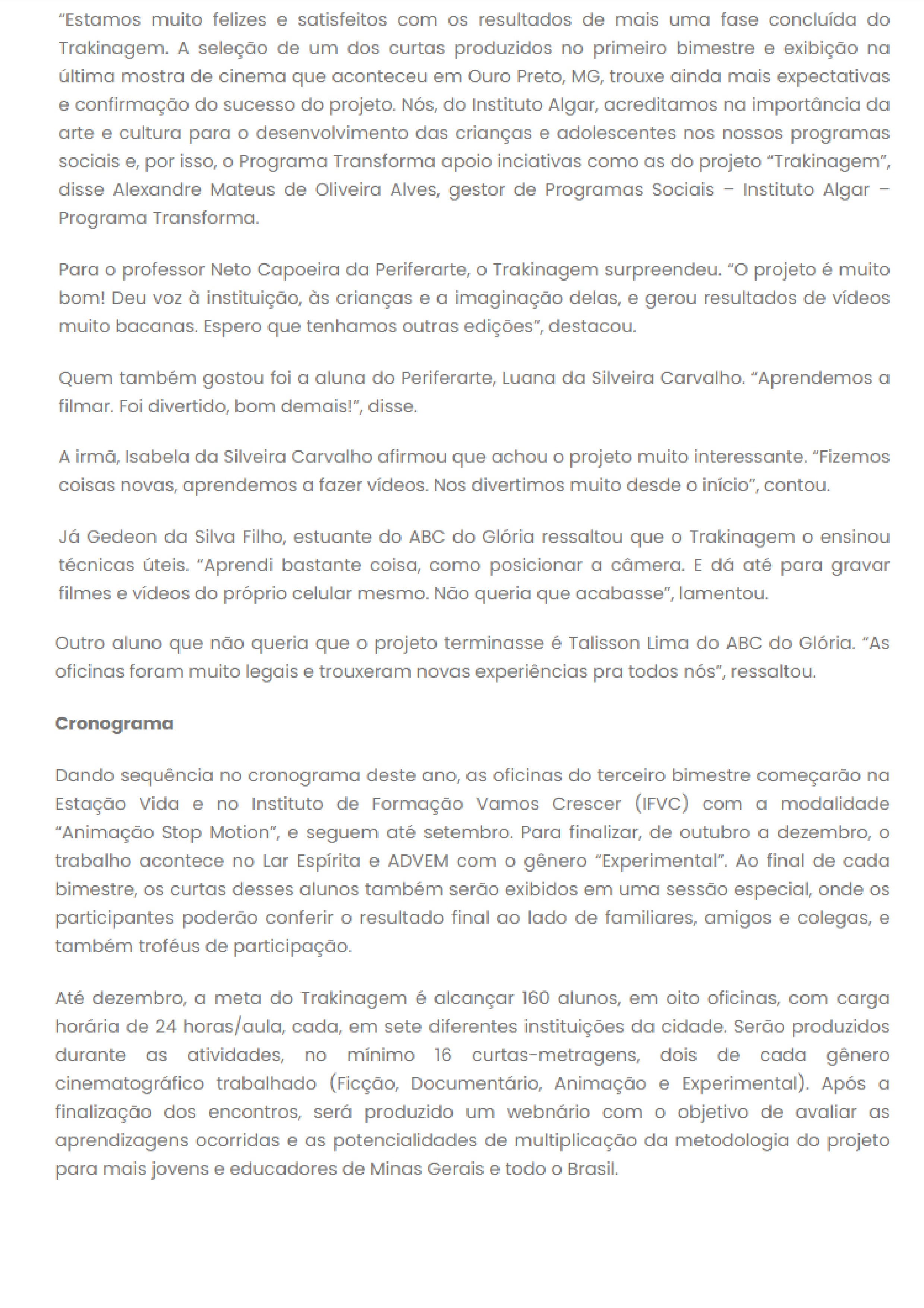 ONLINE - Trakinagem exibe “curtas-documentários” dos alunos da Periferarte e ABC do Glória - 14.07