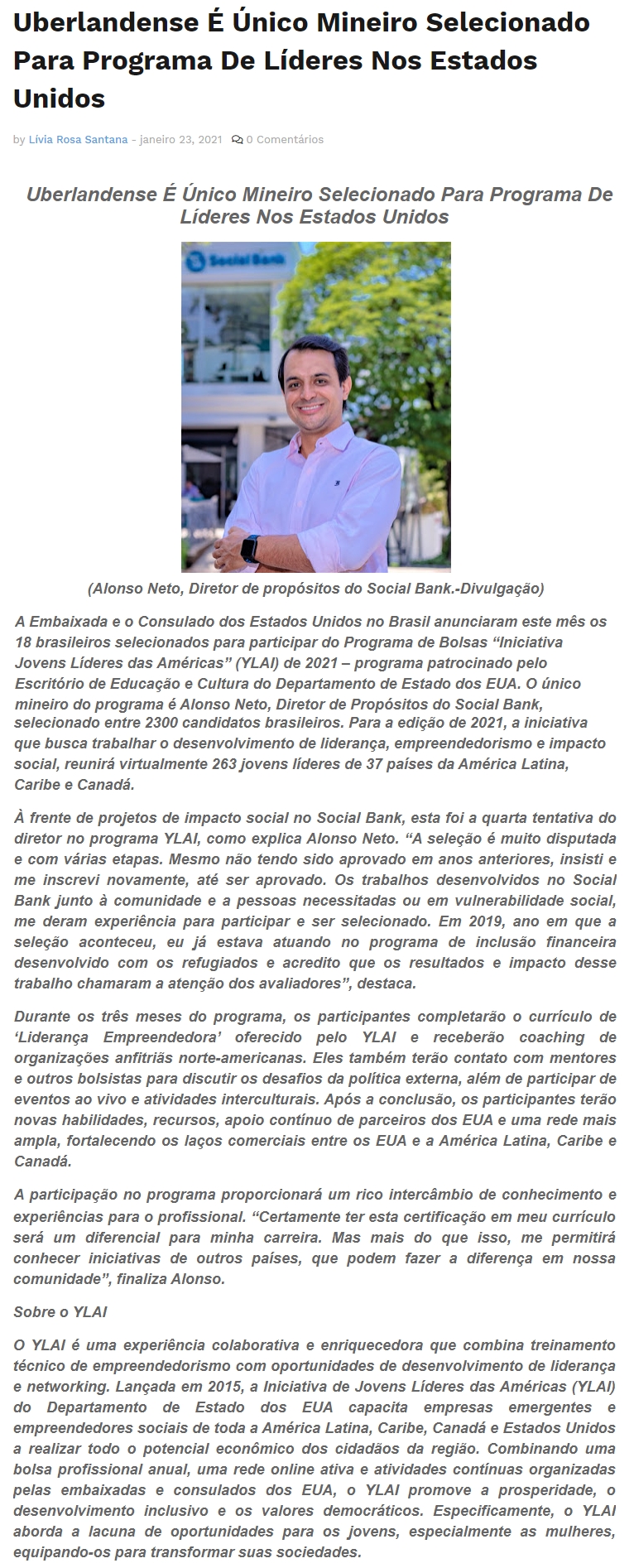 ONLINE - Uberlandense é único mineiro selecionado para programa de líderes nos Estados Unidos - 23/01