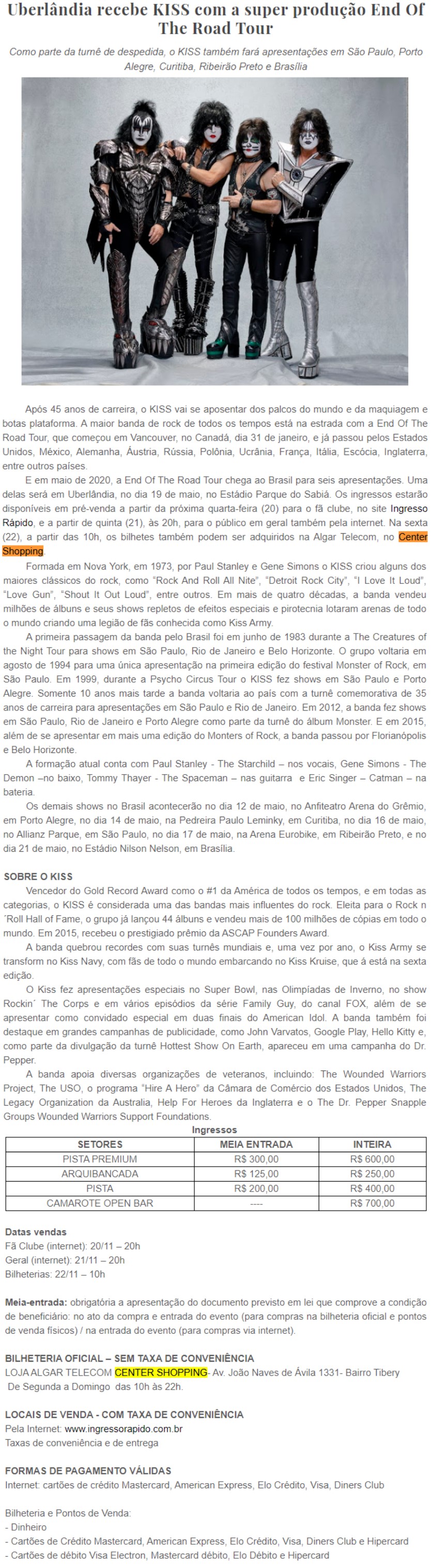 ONLINE - Uberlândia recebe KISS com a super produção End Of The Road Tour - PONTO DE VENDAS (14/11)
