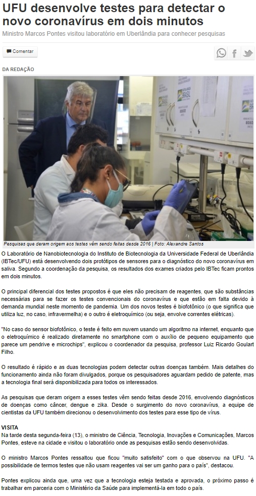 ONLINE - UFU desenvolve testes para detectar o novo coronavírus em dois minutos - 14/04