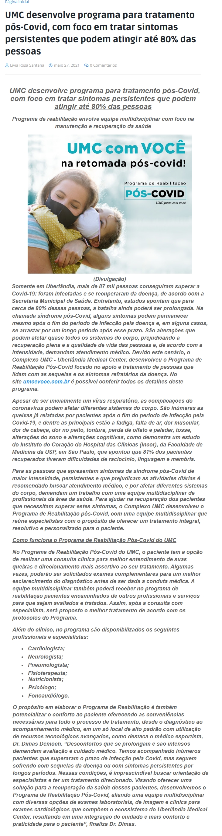 ONLINE - UMC desenvolve programa para tratamento pós-Covid, com foco em tratar sintomas persistentes que podem atingir até 80% das pessoas - 27.05
