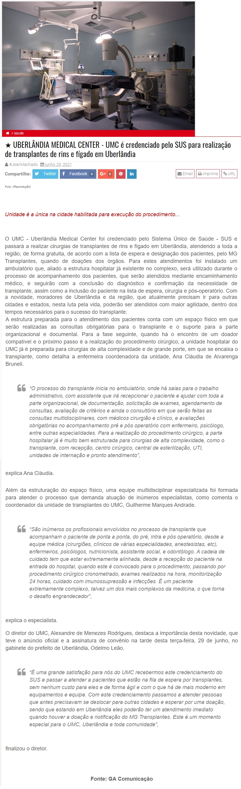 ONLINE - UMC é credenciado pelo SUS para realização de transplantes de rins e fígado em Uberlândia - 29.06