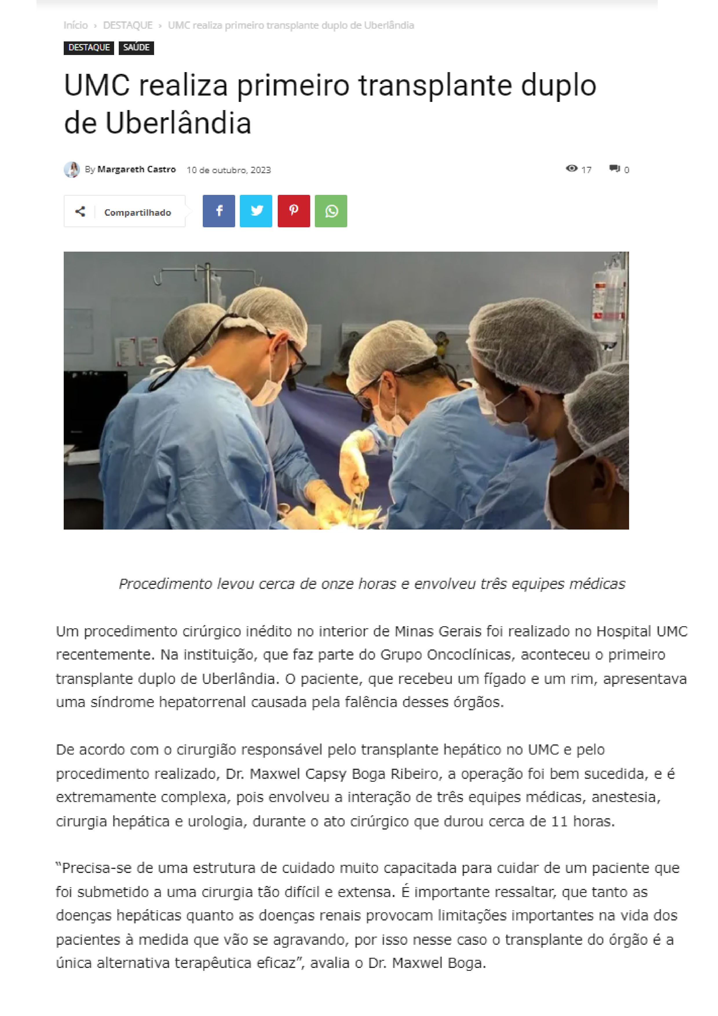 ONLINE - UMC realiza primeiro transplante duplo de Uberlāndia - 10.10