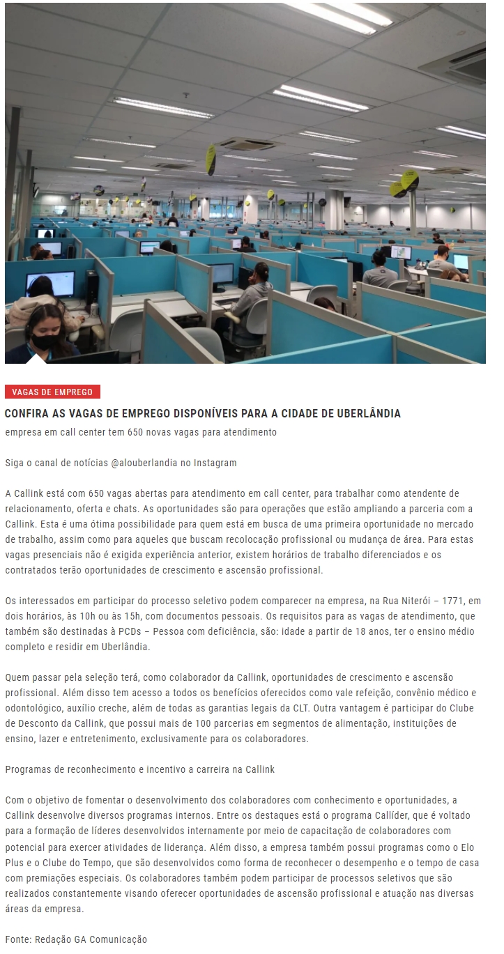 ONLINE VAGAS DE EMPREGO -Callink tem 650 novas vagas para atendimento-25.01