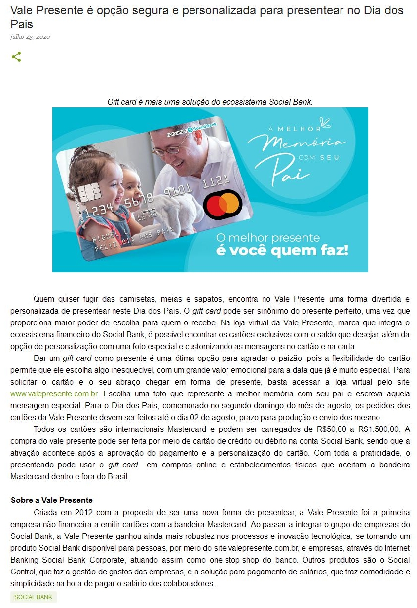 ONLINE - Vale Presente é opção segura e personalizada para presentear no Dia dos Pais - 24/07