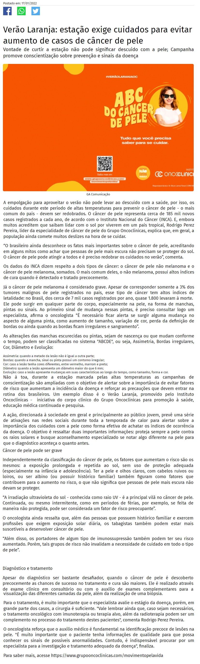 ONLINE-Verão Laranja: estação exige cuidados para evitar aumento de casos de câncer de pele-17.01