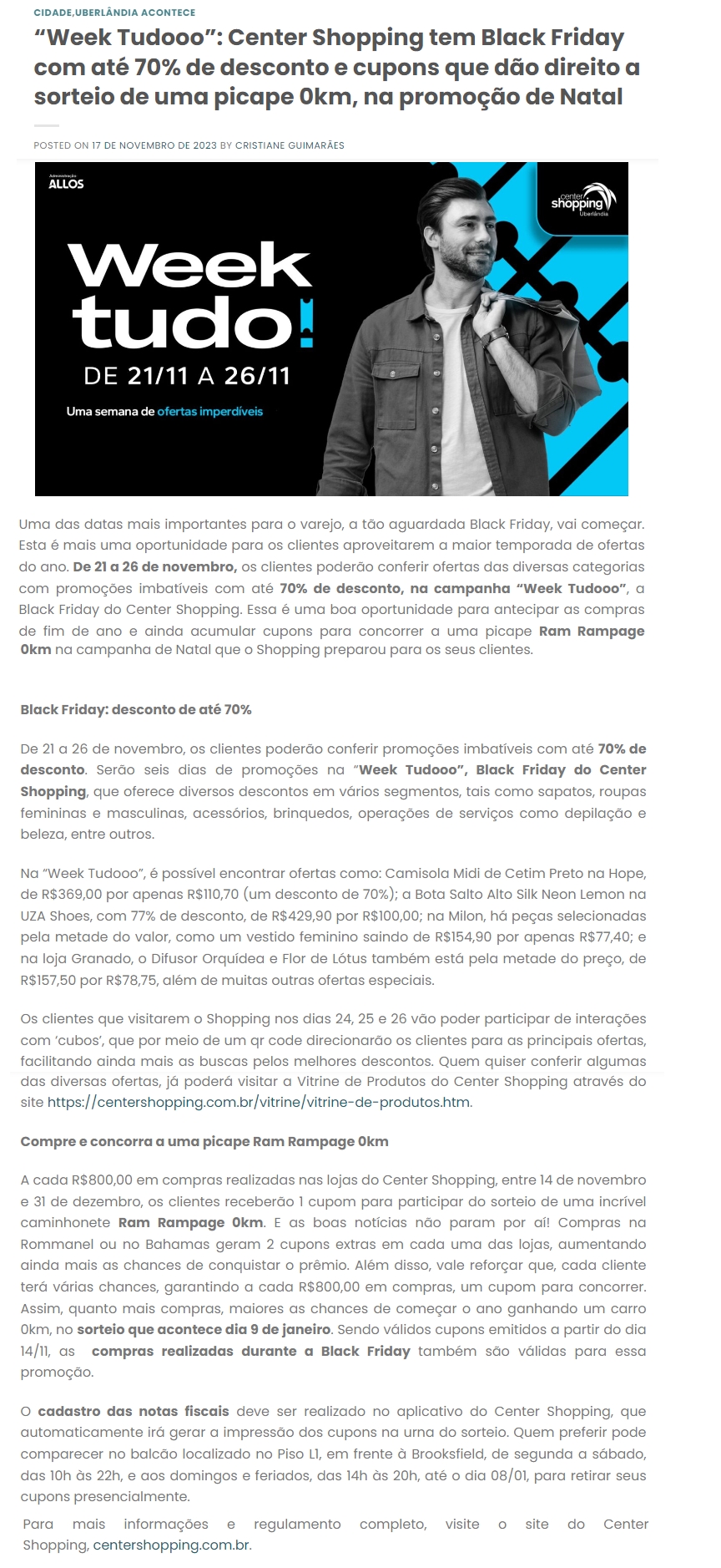 ONLINE-“Week Tudooo”: Center Shopping tem Black Friday com até 70% de desconto e cupons que dão direito a sorteio de uma picape 0km, na promoção -17.1