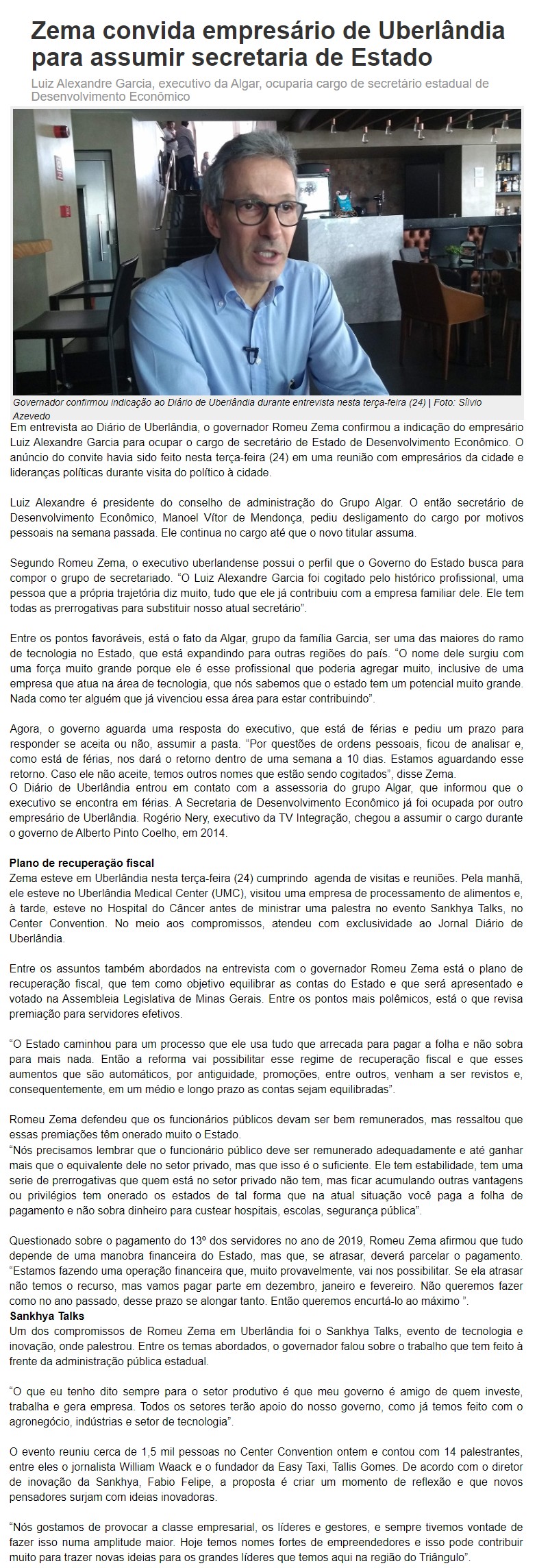 ONLINE - Zema convida empresário de Uberlândia para assumir secretaria de Estado (25/09)