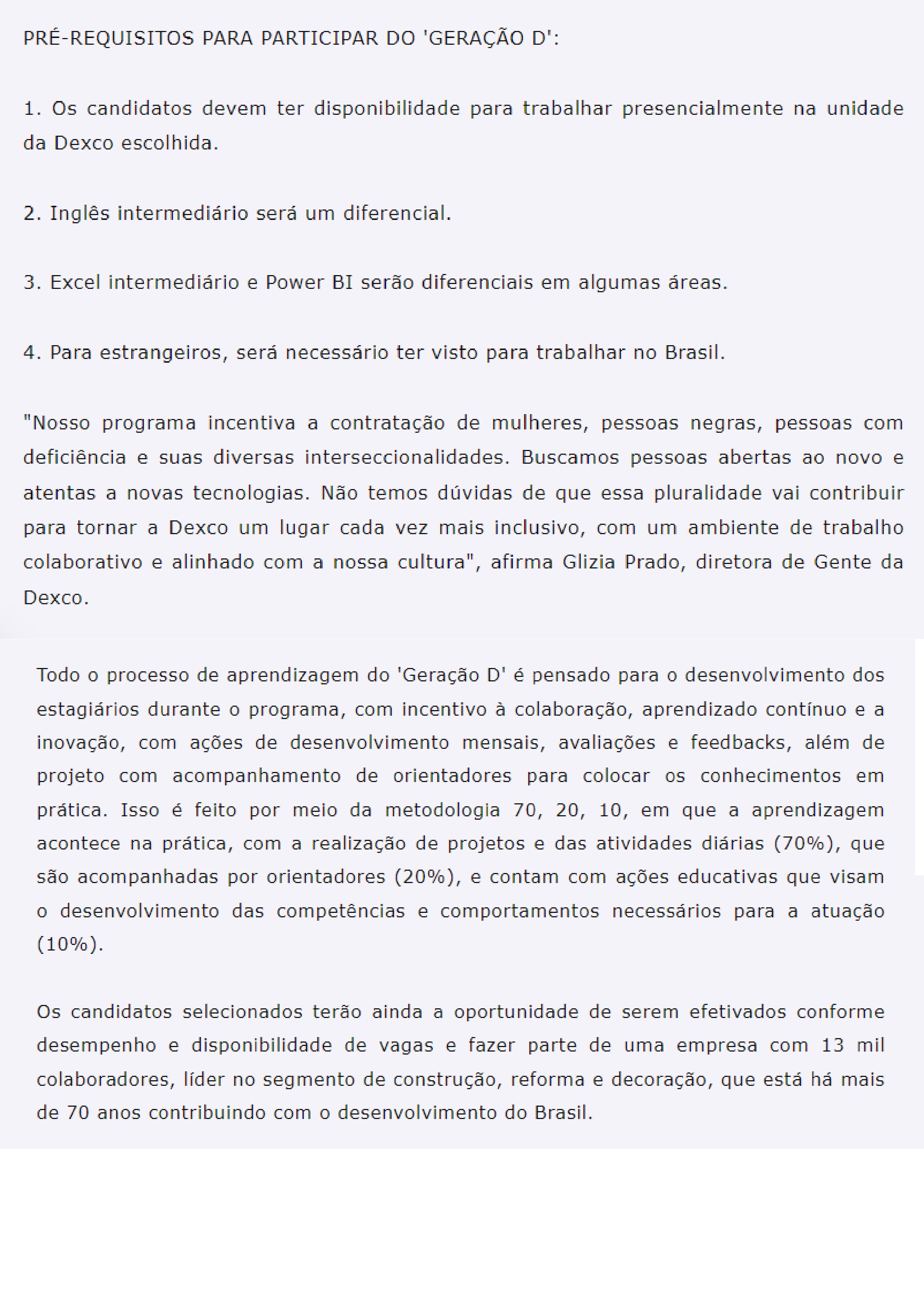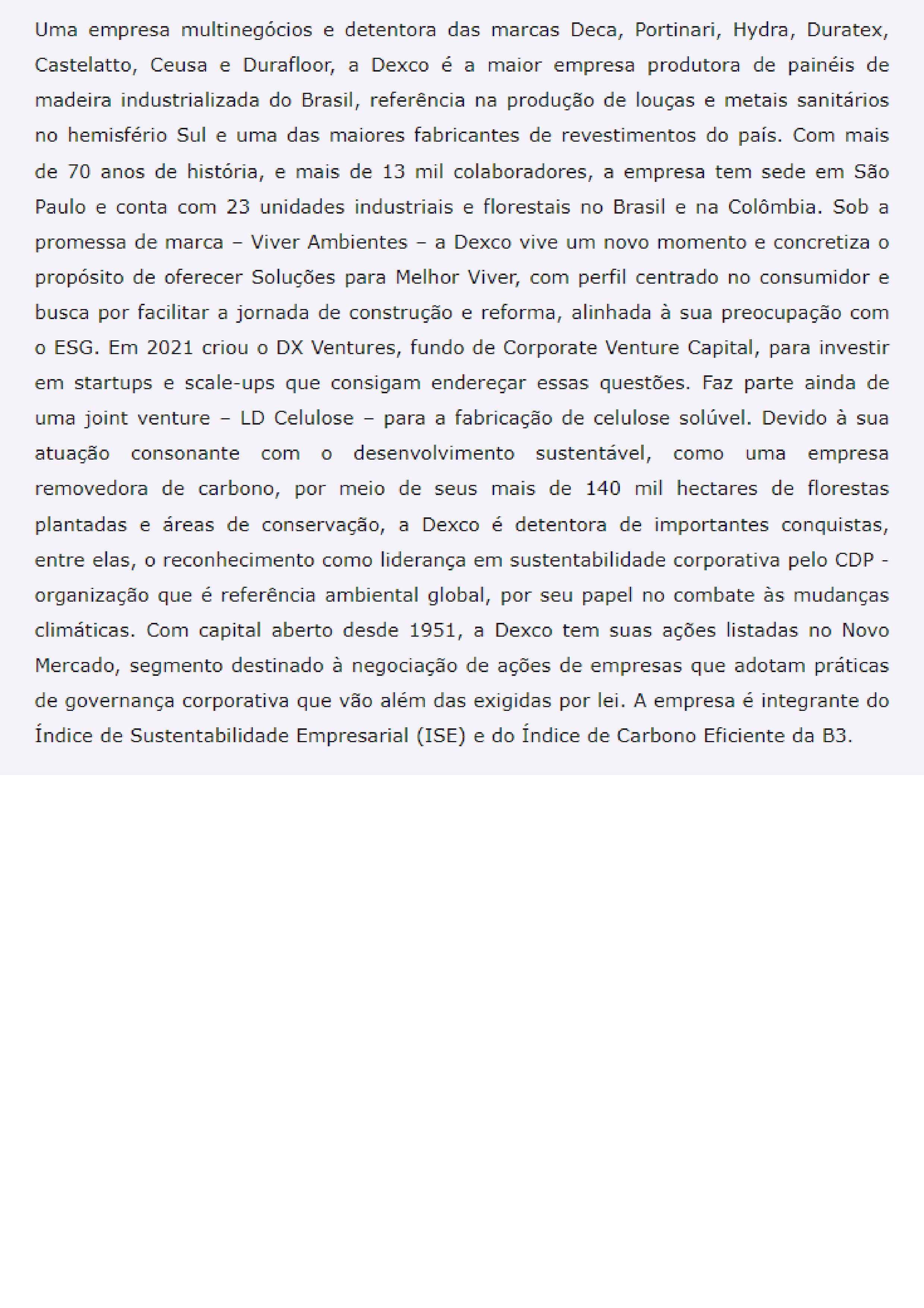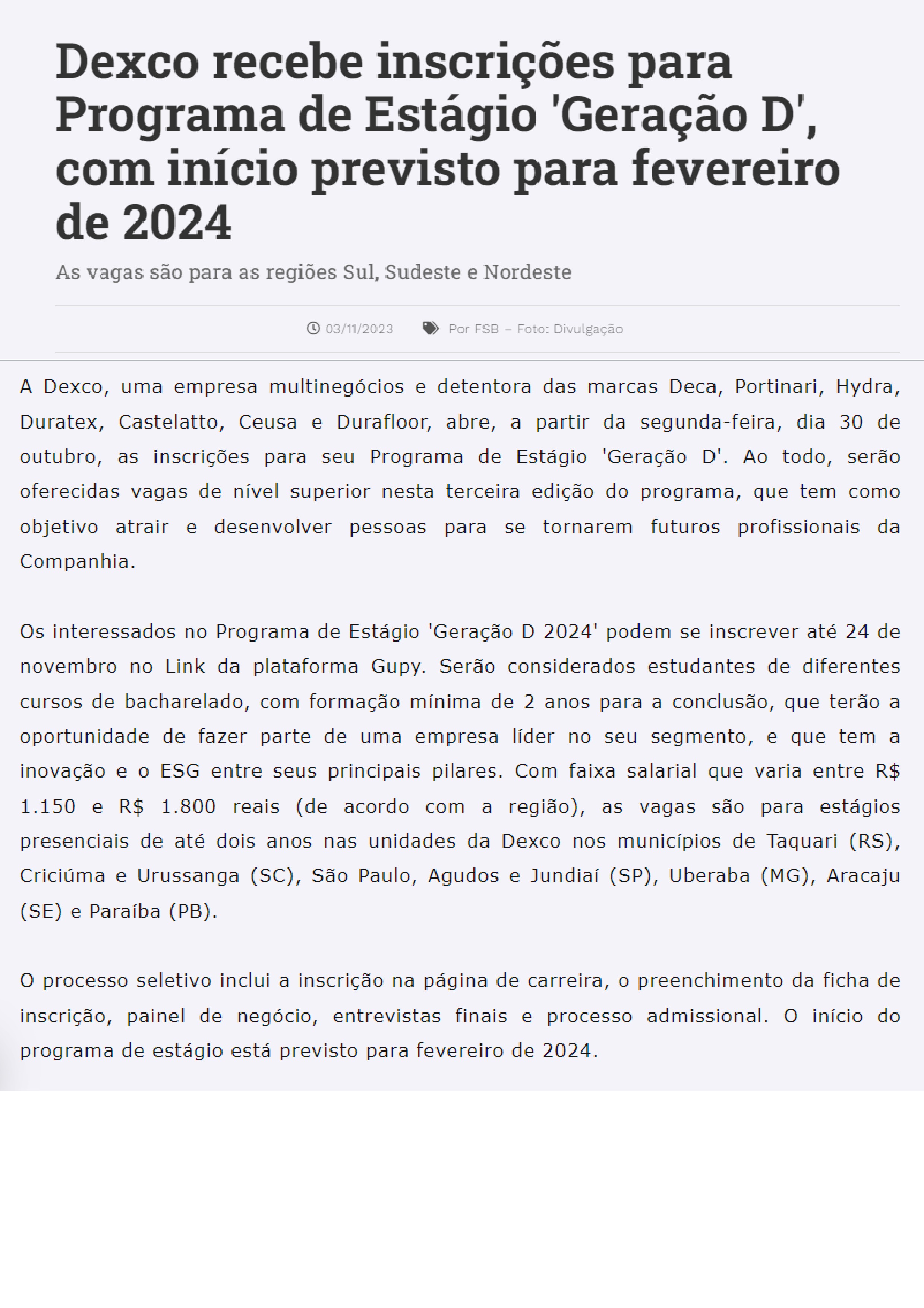 ONLINR - Dexco recebe inscrições para Programa de Estágio 'Geração D', com início previsto para fevereiro de 2024 - 03.11