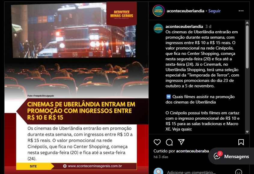Os cinemas de Uberlândia entrarão em promoção durante esta semana