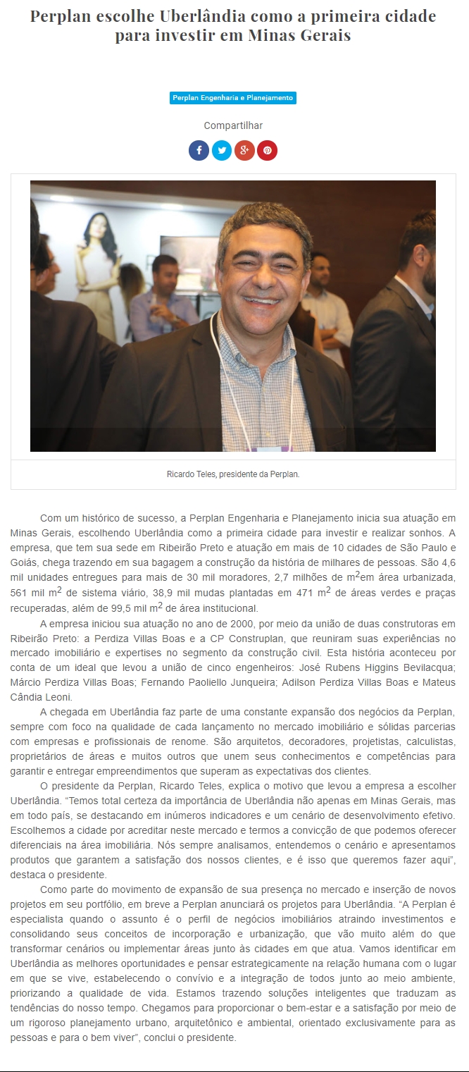 Perplan escolhe Uberlândia como a primeira cidade para investir em Minas Gerais