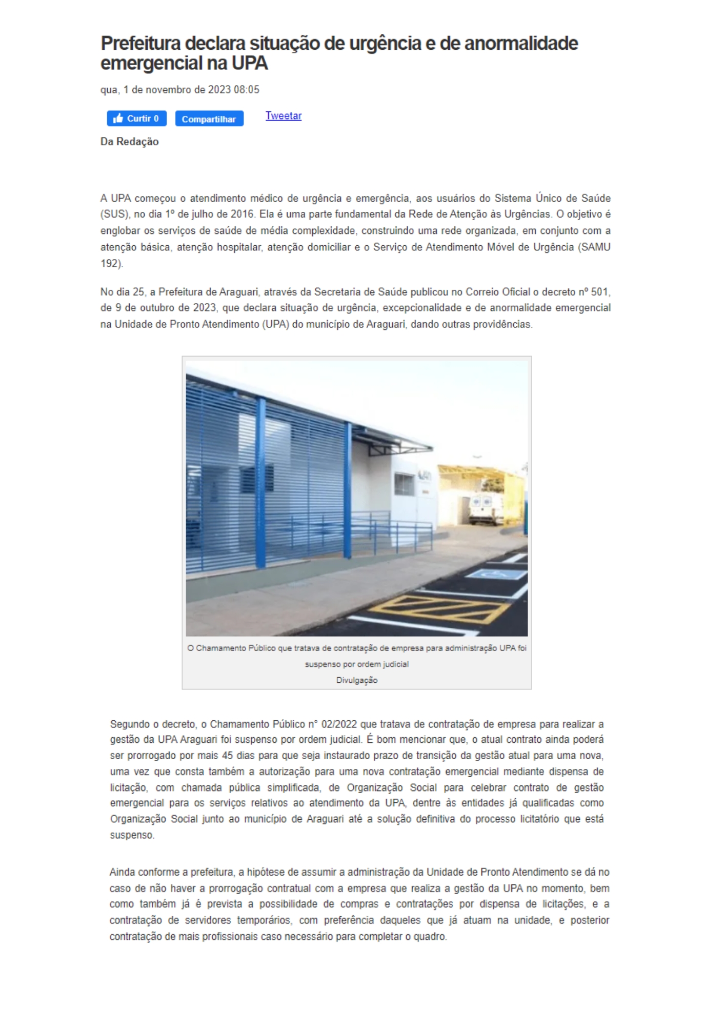 Prefeitura declara situação de urgência e de anormalidade emergencial na UPA