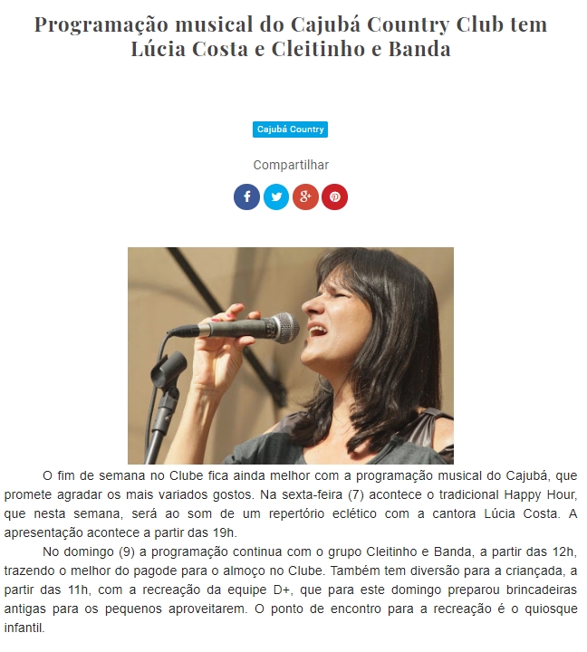 Programação musical do Cajubá Country Club tem Lúcia Costa e Cleitinho e Banda