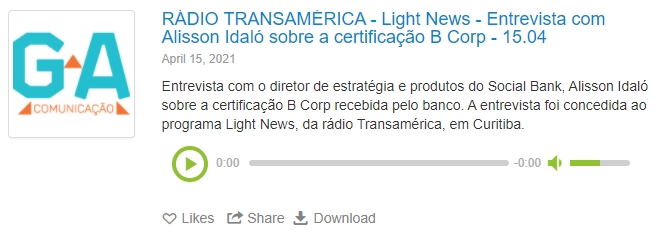 RÁDIO TRANSAMÉRICA - Light News - Entrevista com Alisson Idaló sobre a certificação B Corp - 15.04