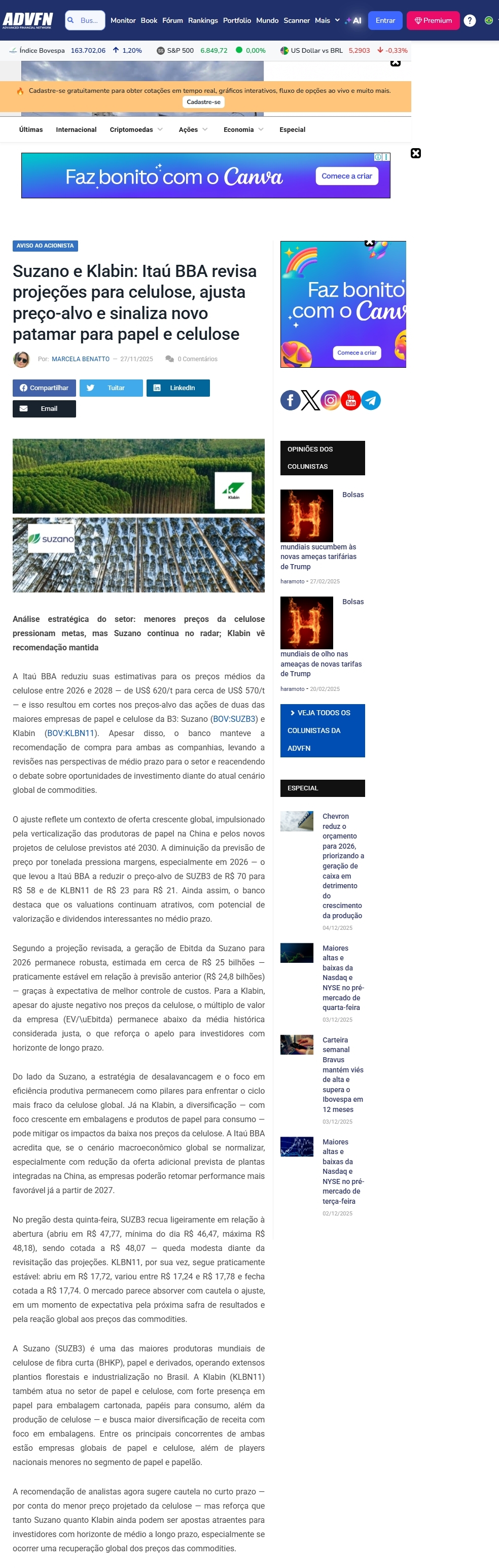 https://br.advfn.com/jornal/2025/11/suzano-e-klabin-itau-bba-revisa-projecoes-para-celulose-ajusta-preco-alvo-e-sinaliza-novo-patamar-para-papel-e-celulose