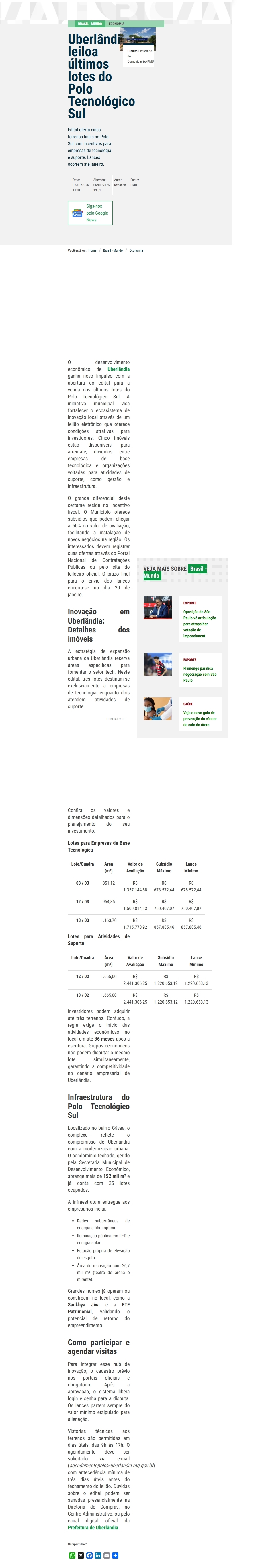 Uberlândia leiloa últimos lotes do Polo Tecnológico Sul
