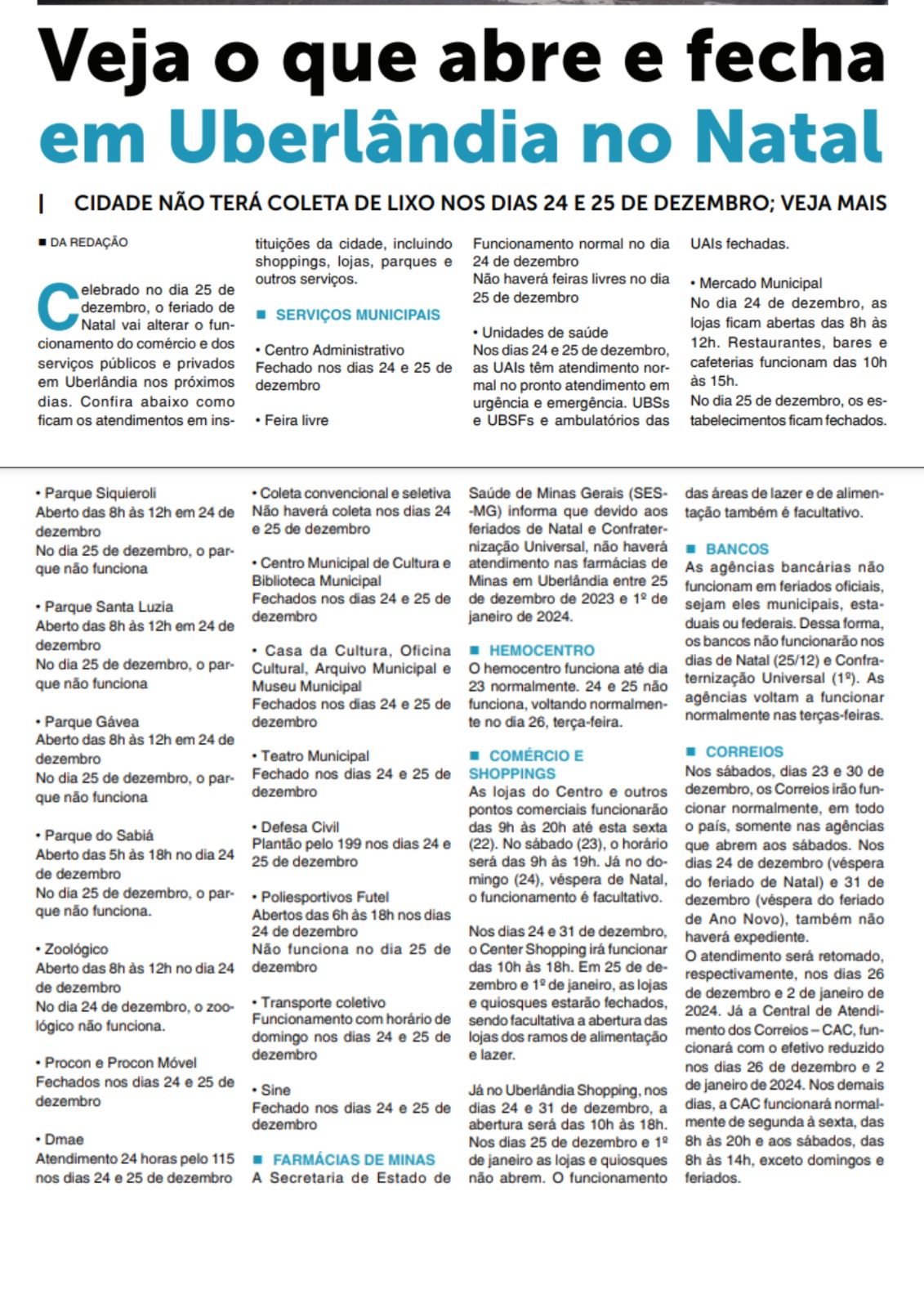 Veja o que abre e fecha em Uberlândia no Natal - 23.12
