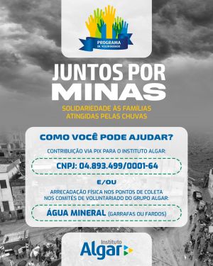 Com as fortes chuvas que atingiram recentemente as cidades de Juiz de Fora e Ubá, em Minas Gerais, deixando famílias desabrigadas e em situação de vulnerabilidade social, o Instituto Algar promove a campanha solidária “Juntos Por Minas”, mobilização para a arrecadação de doações para apoiar os afetados. Para contribuir é possível destinar valores via PIX para a chave 04.893.499/0001-64 (CNPJ do Instituto Algar) ou doar água mineral nos pontos de coleta.